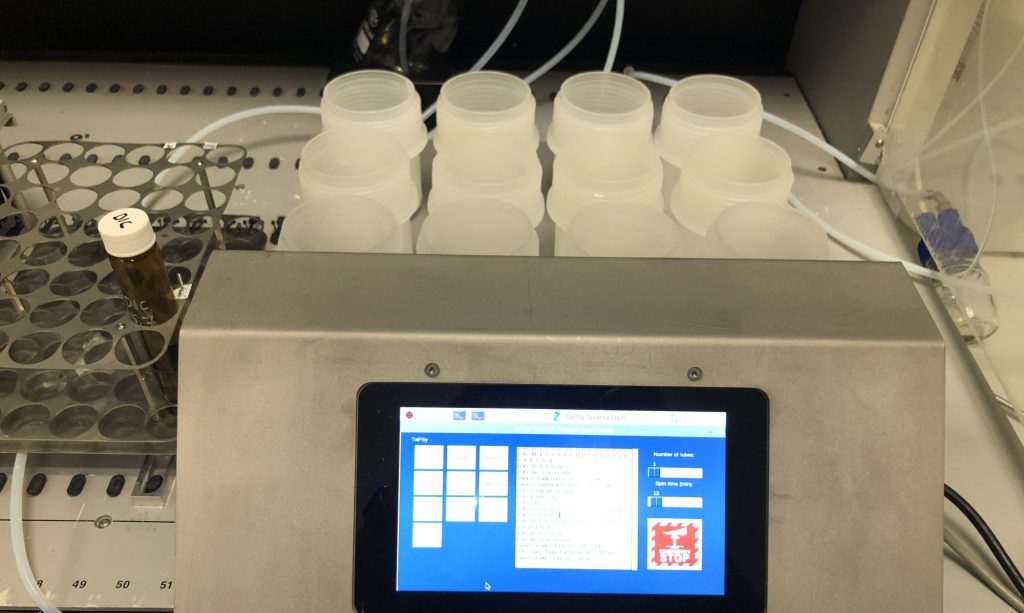 The development of peptide-based pharmaceutics is a hot topic in the pharmaceutical industry and in basic research. However, from the research and development perspective there is an unmet need for new, alternative, solid-phase peptide synthesizers that are highly efficient, automated, robust, able to synthetize peptides in parallel, inexpensive (to obtain and operate), have potential to be scaled up, and even comply with the principles of green chemistry. Moreover, a peptide synthesizer of this type could also fill the gap in university research, and therefore speed the advancement of peptide-based pharmaceutical options. This paper presents a Tecan add-on peptide synthesizer (TaPSy), which has operational flexibility (coupling time: 15–30 min), can handle all manual synthesis methods, and is economical (solvent use: 34.5 mL/cycle, while handling 0.49 mmol scale/reactor, even with ≤3 equivalents of activated amino acid derivatives). Moreover, it can carry out parallel synthesis of up to 12 different peptides (0.49 mmol scale in each). TaPSy uses no heating or high pressure, while it is still resistant to external influences (operating conditions: atmospheric pressure, room temperature 20–40 ˚C, including high [>70%] relative humidity). The system’s solvent can also be switched from DMF to a green and biorenewable solvent, γ-valerolactone (GVL), without further adjustment. The designed TaPSy system can produce peptides with high purity (>70%), even with the green GVL solvent alternative. In this paper we demonstrate the optimization path of a newly developed peptide synthesizer in the context of coupling reagents, reaction time and reagent equivalents applying for a synthesis of a model peptide. We compare the results by analytical characteristics (purity of raw material, crude yield, yield) and calculated overall cost of the syntheses of one mg of crude peptide using a specified set of reaction conditions.